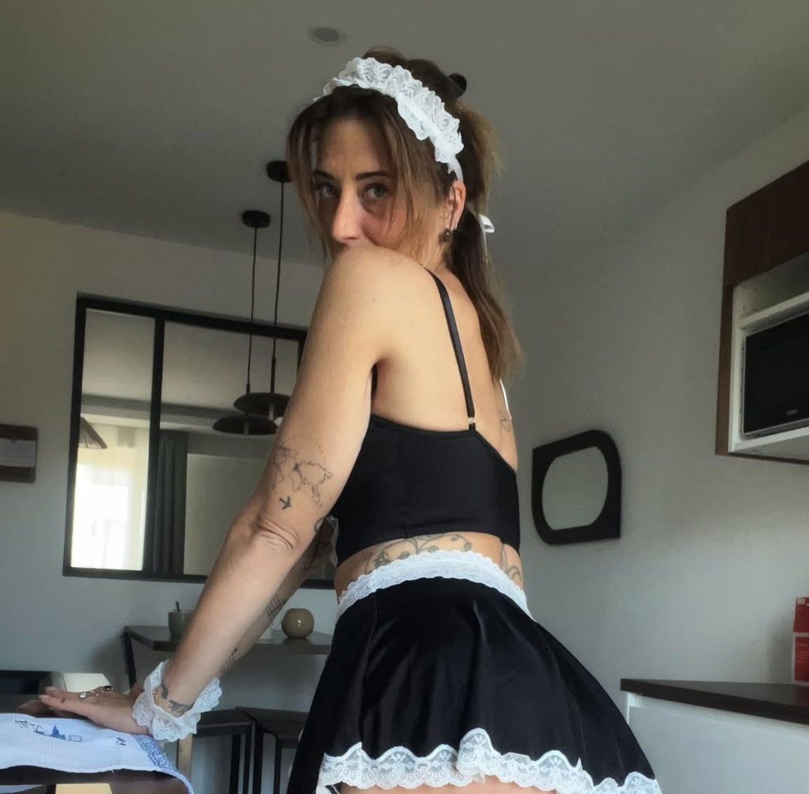 She is working on her creations (lingerie, fashion pieces, lifestyle accessories or handmade items depending on the universe).