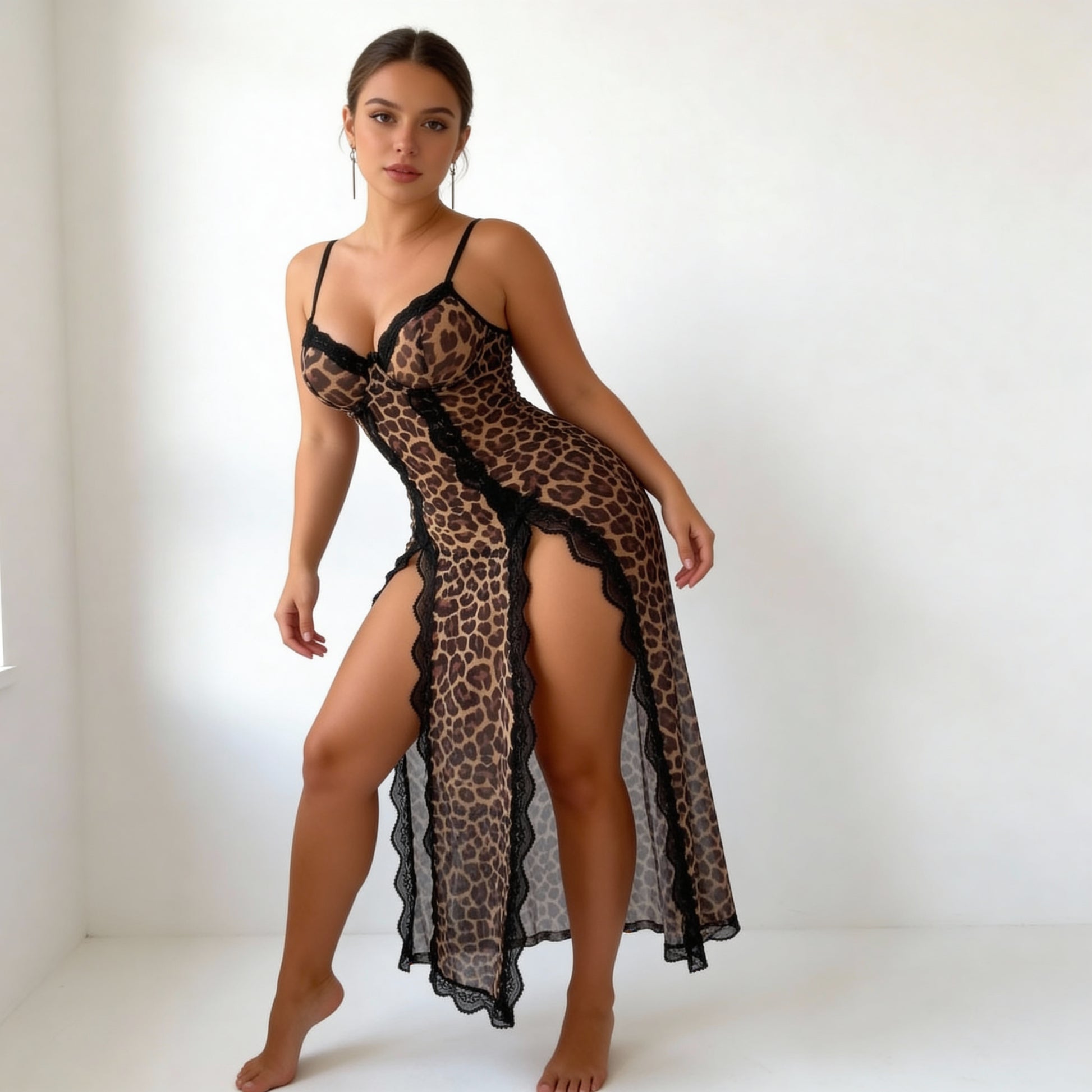 Cette robe léopard en dentelle noire incarne la séduction sauvage. Son imprimé animalier et sa coupe sculptante mettent en valeur les courbes avec élégance. Parfaite pour une soirée spéciale, elle combine féminité assumée et détails sensuels.