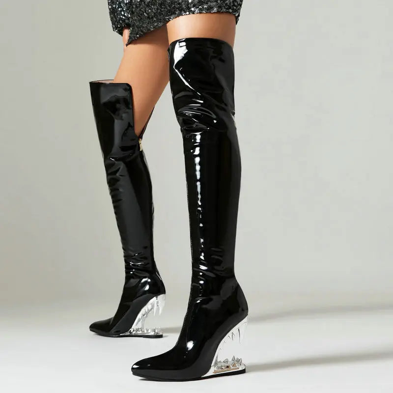 Ces cuissardes femme hautes au-dessus du genou allient allure moderne et fonctionnalité hivernale. Botte longue avec mollets larges, elles se démarquent par leur tige en cuir verni et leur motif Dents Tigre Requin, apportant une touche distinctive à un look soir comme jour. Conçues pour sublimer une silhouette tout en restant adaptées à la vie quotidienne, elles s’inscrivent dans une démarche lifestyle moderne et premium.
