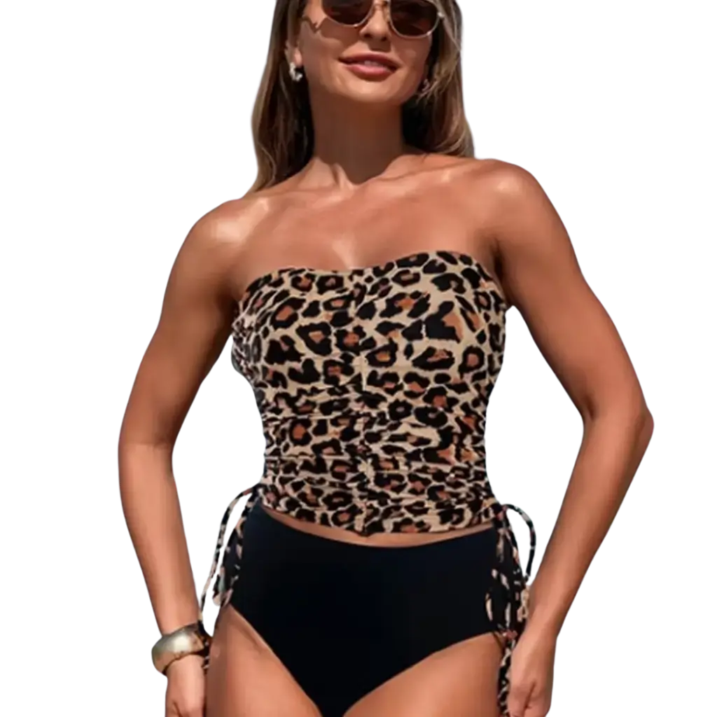 Affirmez votre style à la plage avec Volga, un maillot de bain 2 pièces au motif léopard audacieux. Le haut bustier assure maintien et élégance, tandis que le bas noir taille haute allonge visuellement la silhouette.