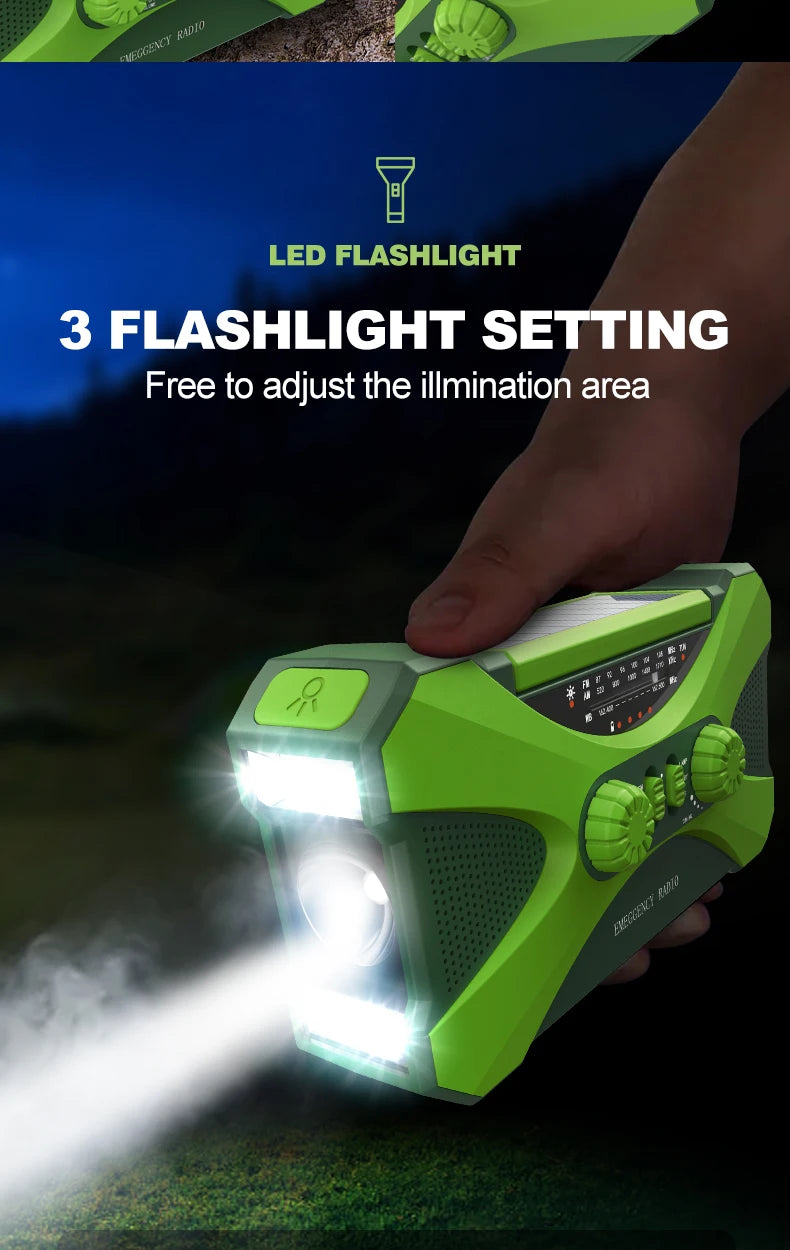 - Recharge 3-en-1 : par câble USB, panneau solaire ou manivelle