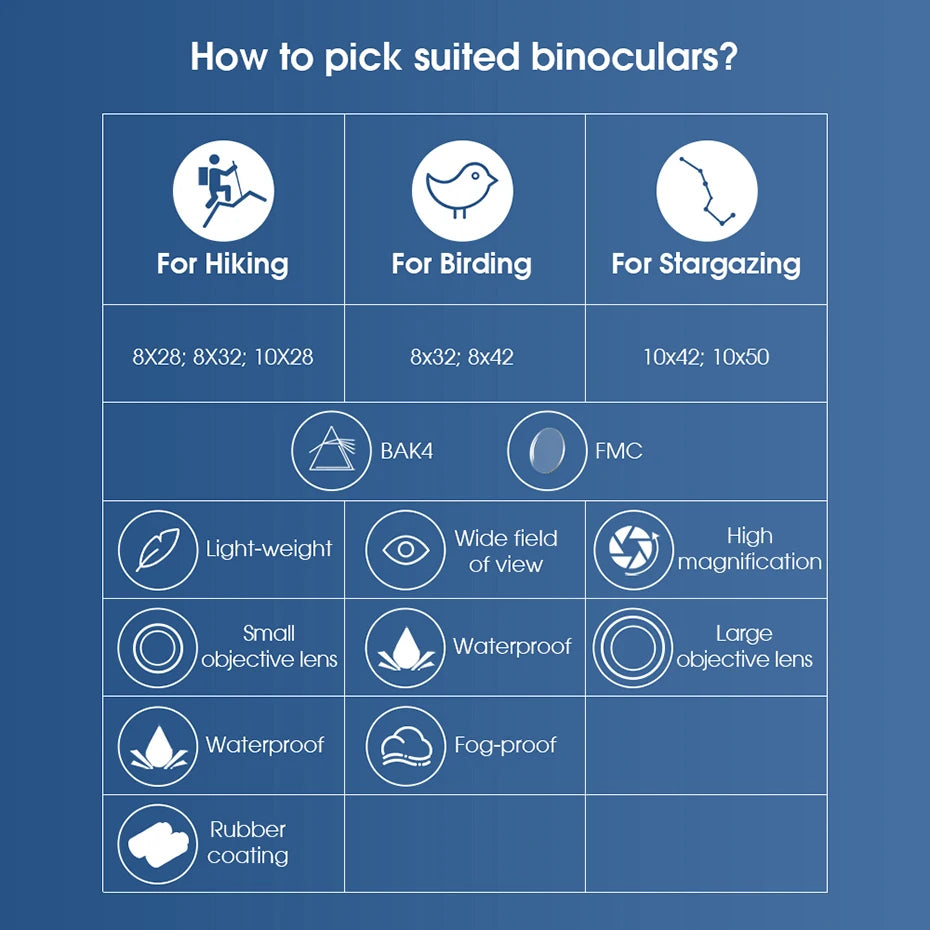 - Optique de haute qualité: prismes BAK4 et lentilles FMC pour une transmission lumineuse élevée et des couleurs fidèles